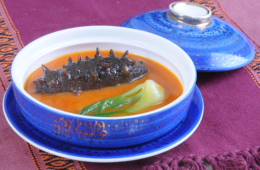 2、鍋中放入高湯,海參燒10分鐘,加入所有調料燒開,勾芡,裝盤即可。