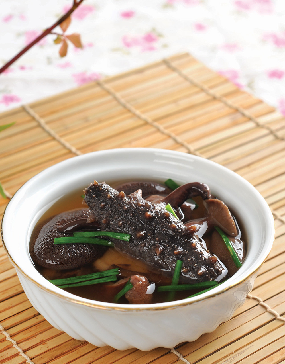 3.另起鍋,放入高湯,投入海參及各種配料,放入鹽、雞汁、味精、胡椒粉燒開(kāi),撇去浮沫,撒上香蔥即可。